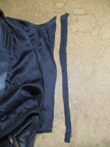 19枚目は裏地側の袖山の生地も表のレザー部分と同じ長さをカットしていきます。