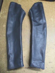 7枚目は脇から裾のサイドのレザーをカットして細く仕上げていきます。