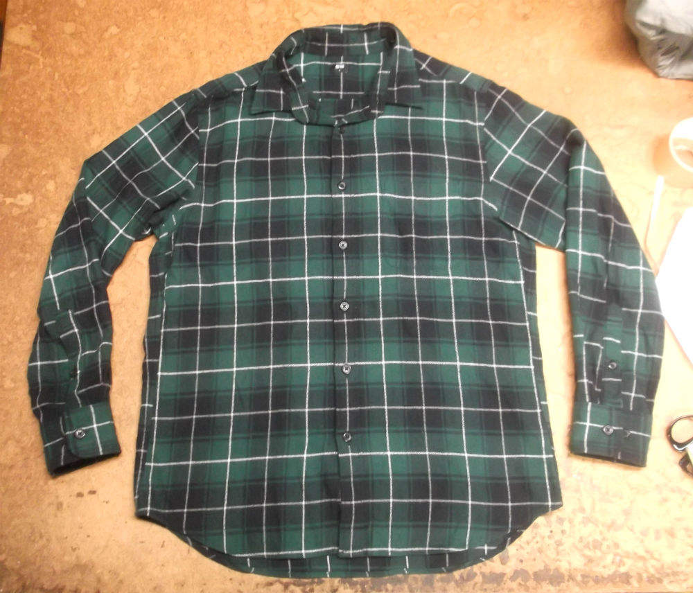 11枚目は胴体を着丈以外の肩幅、身幅、裾幅を見本のシャツの幅に合う様に生地をカットした後です。