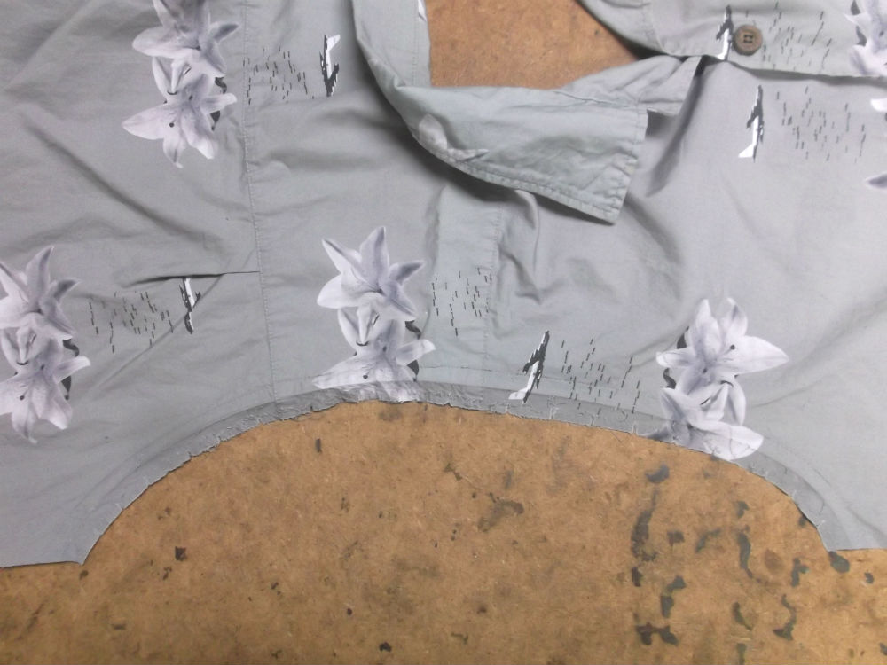 裾のデザインは大きいサイズのシャツのデザインのままで着丈の長さだけを見本の長さに合わせていきます。