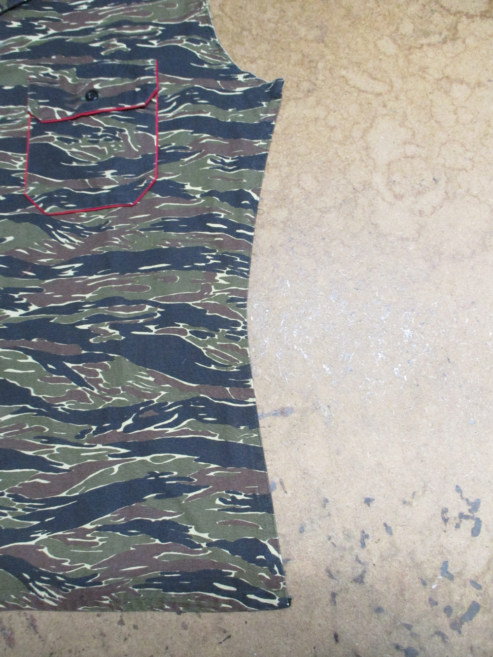 4枚目は胴体の前身ごろの脇から裾のサイドの生地をカットして見本のシャツの幅に近づけていきます。