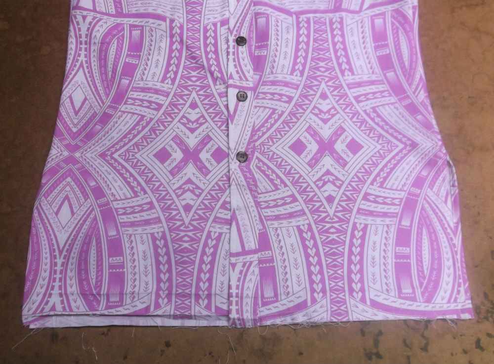 今回の見本のシャツの着丈のデザインは前と後ろが長くて前身ごろと後ろ見ごろが縫い合わさってる部分の裾が短い