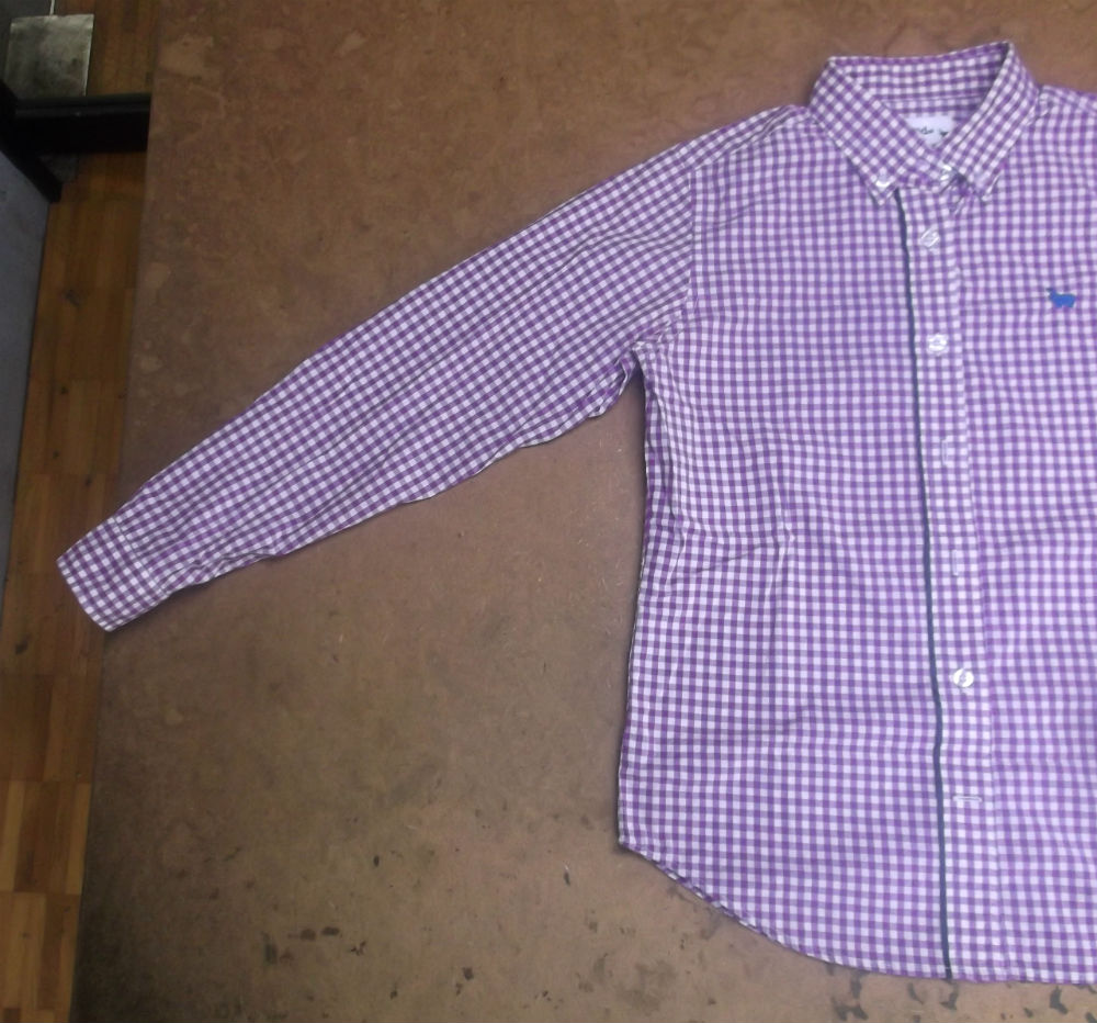 このシャツの肩幅、身幅、裾幅、袖幅、袖丈、着丈を測って大きいサイズのシャツを小さくしていきます。