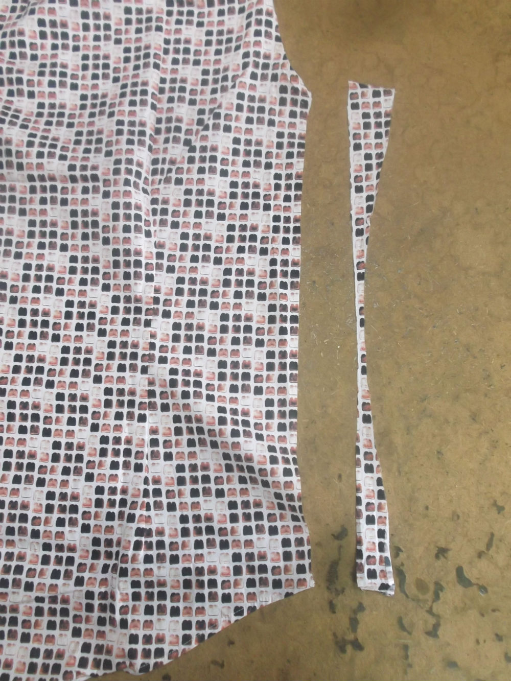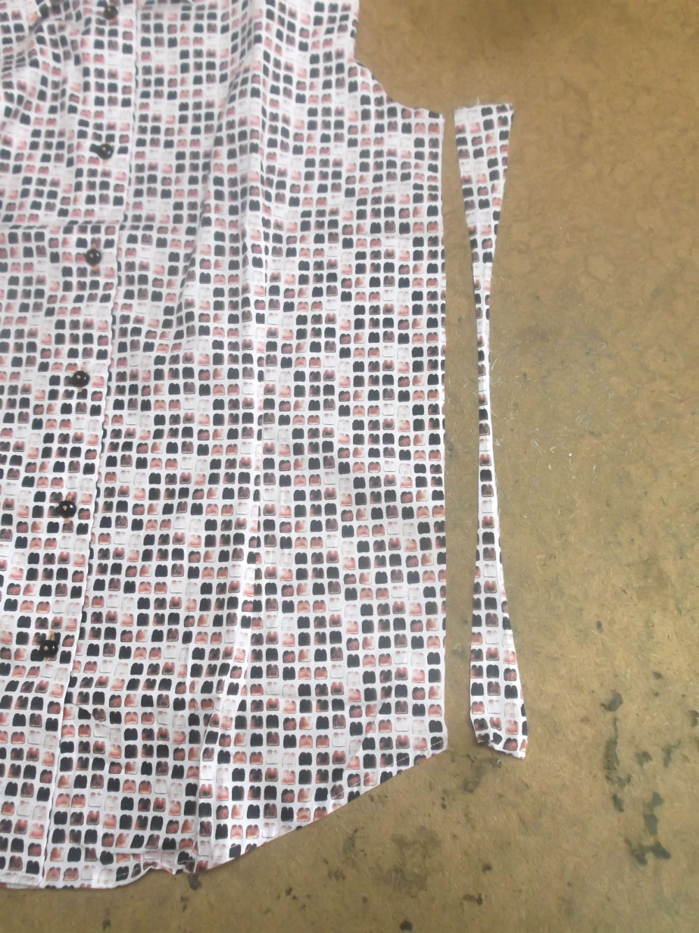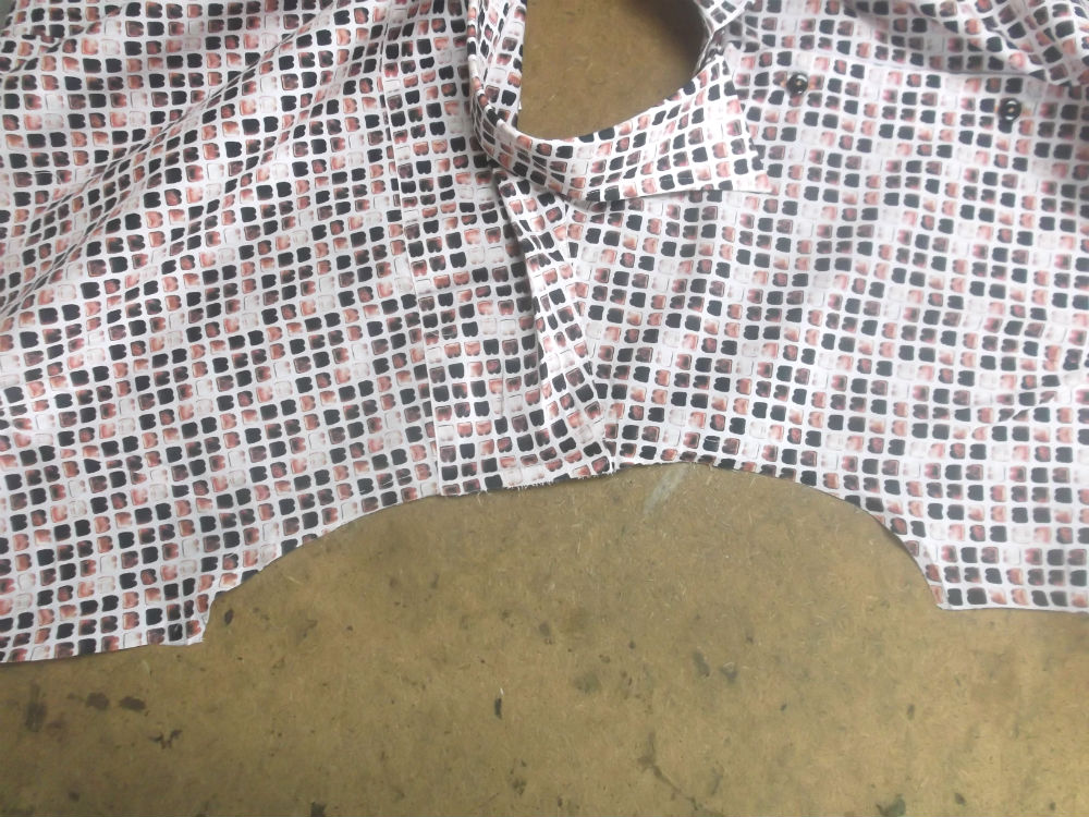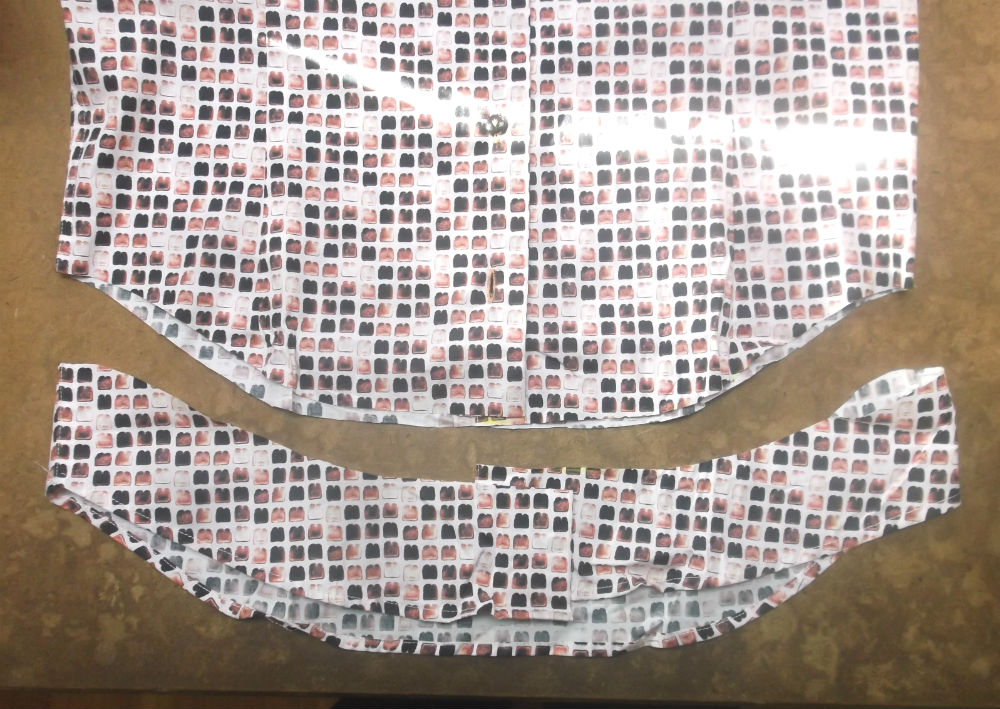 9枚目はシャツの胴体の着丈以外の肩幅、身幅、裾幅の生地をカットした後の写真です。