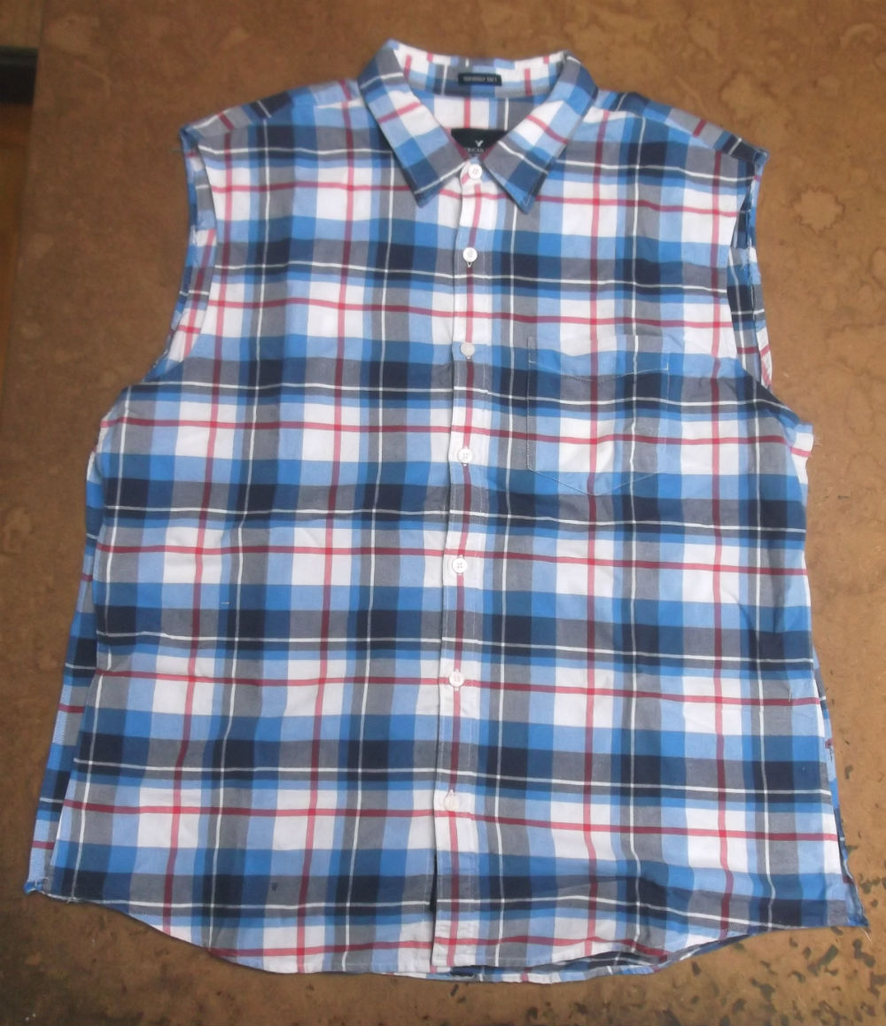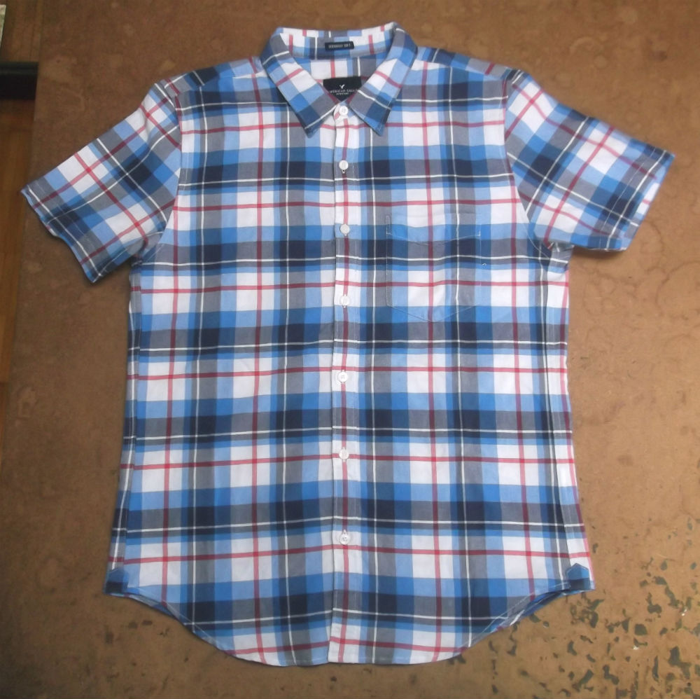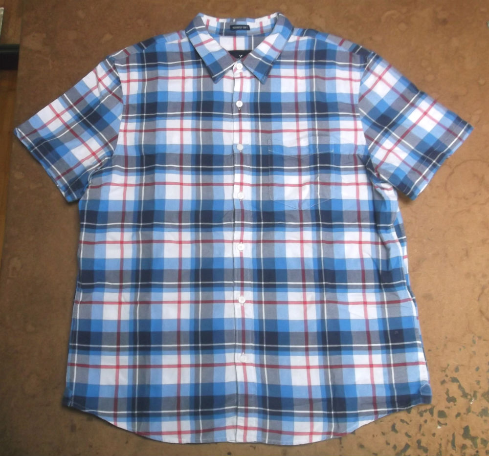 大きいサイズのチェック柄の半袖シャツをお客さんの気に入ったサイズのシャツを見本でお借りまして小さくリサイズしていきます。