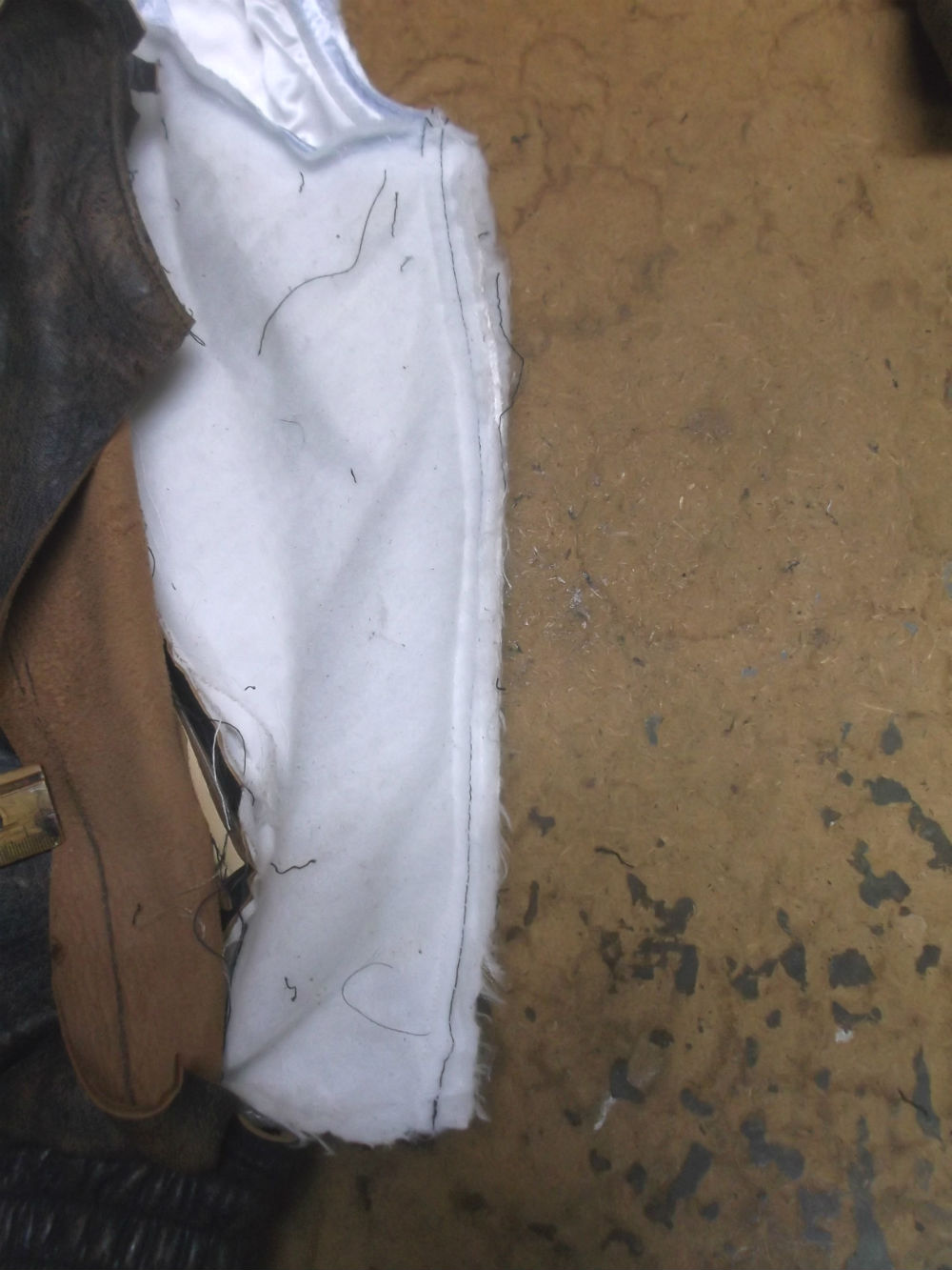 11枚目は裏地の肩幅の生地も表のレザー部分と同じ幅をカットしていきます。