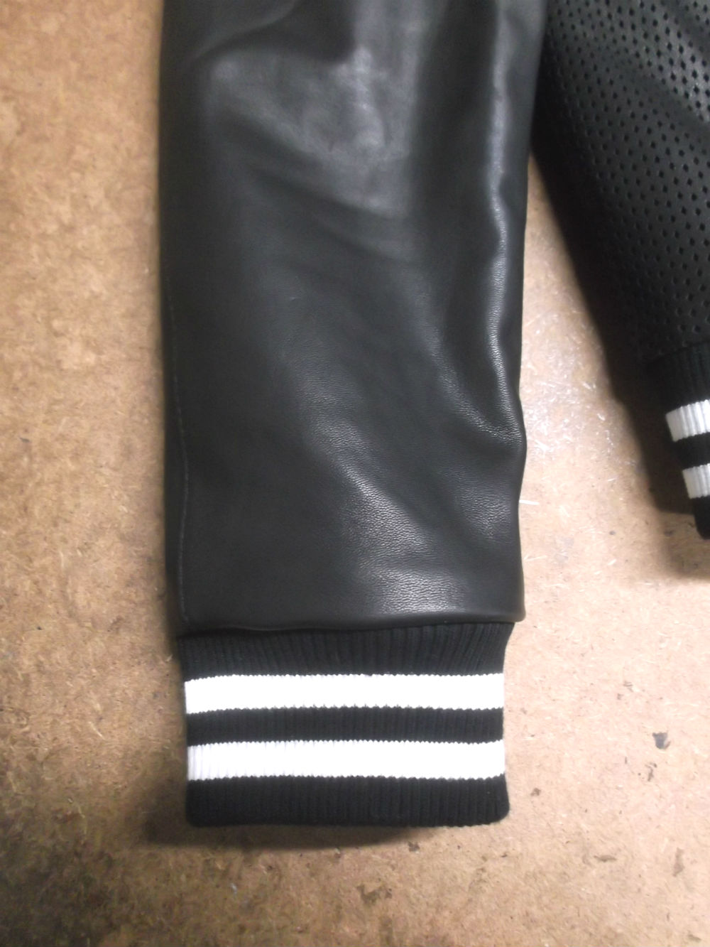 2枚目は袖先のリブニットを外して袖上のレザー部分と裏地の生地をカットして袖丈を短くしていきます。