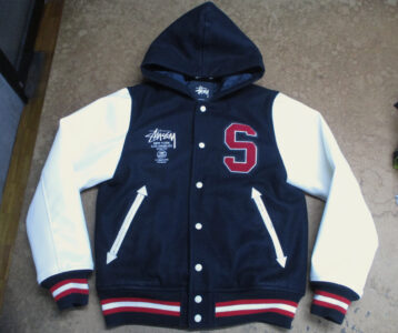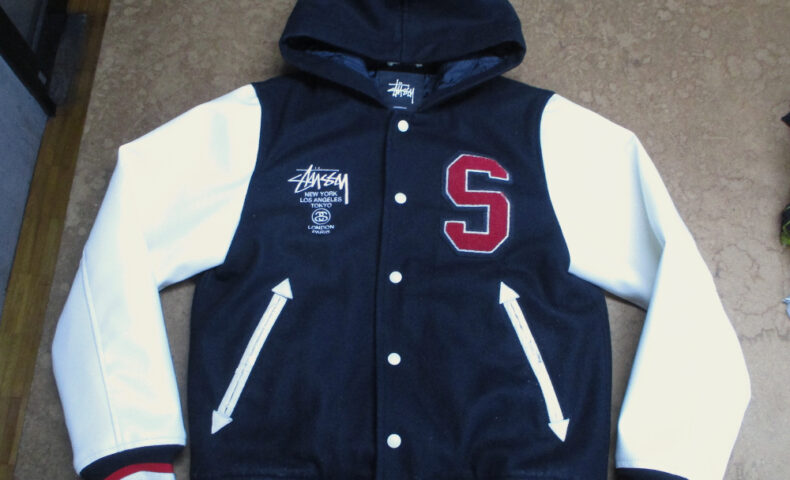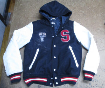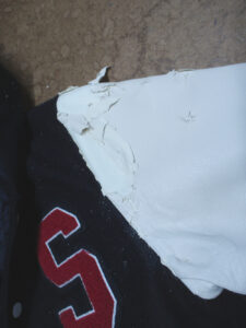 ステューシーのスタジャンの左右の袖のパーツの合皮が剥がれてるので新しい生地に交換していきます。
