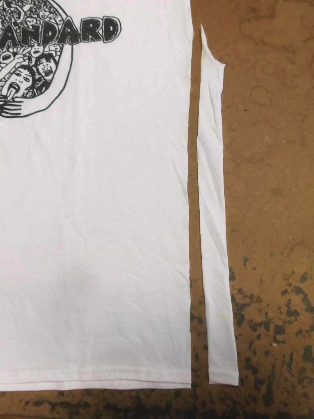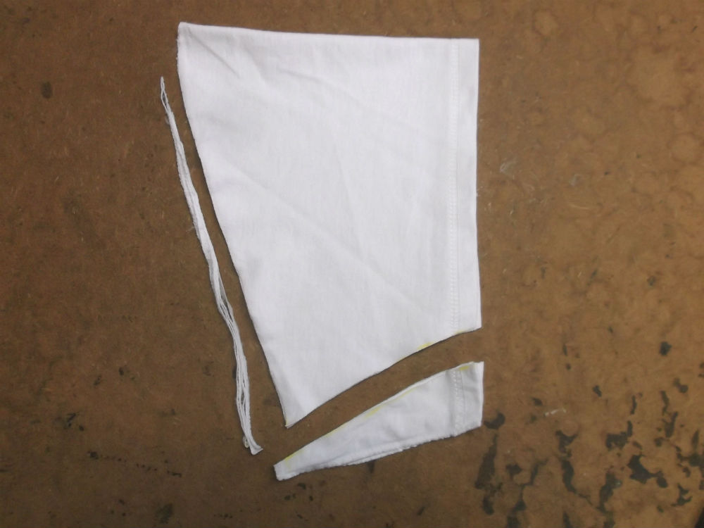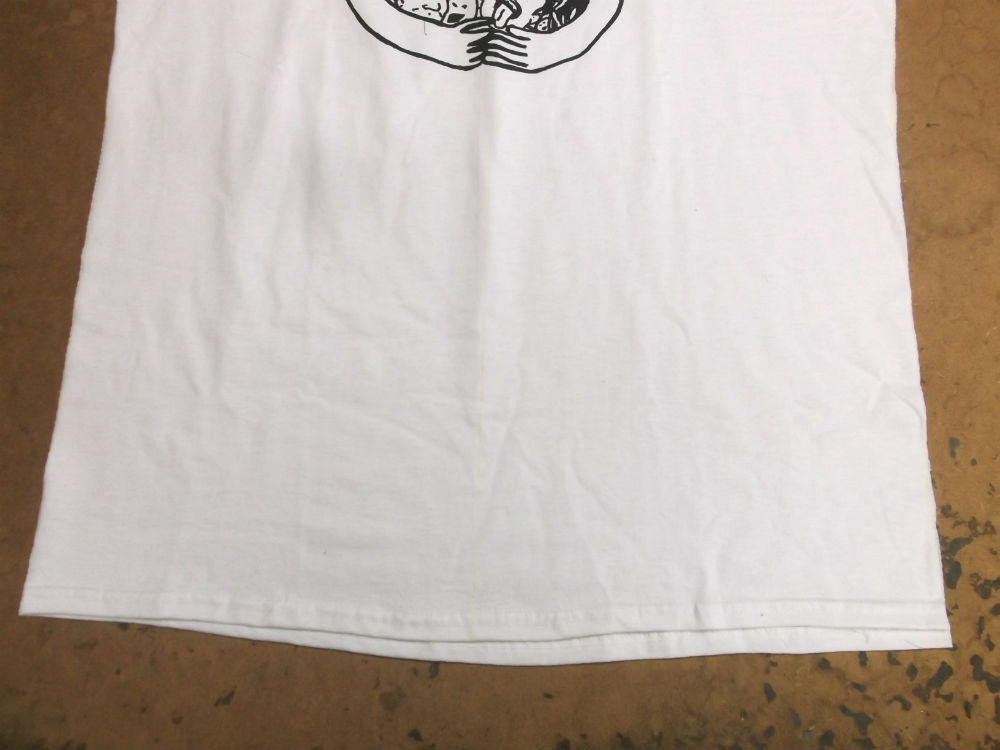 3枚目は左右の袖のパーツをアームホールの縫い目から外した後のTシャツの胴体です。