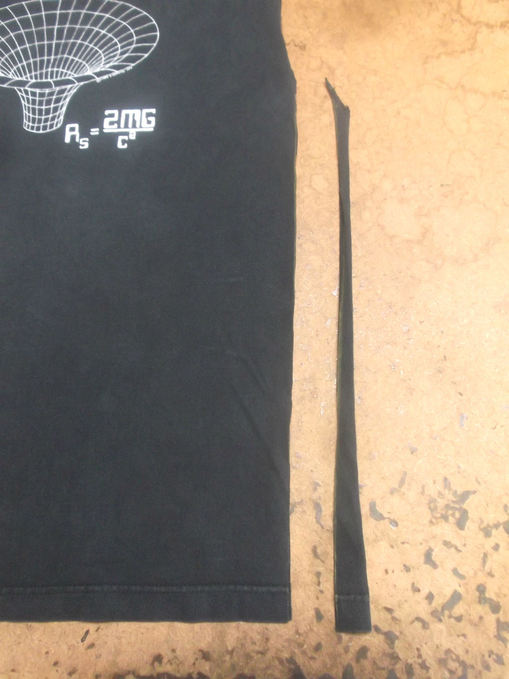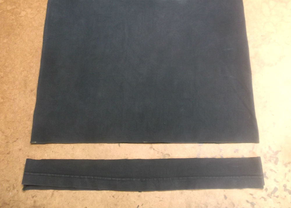 4枚目は脇から裾のサイドの身幅と裾幅を見本のTシャツの幅に合わせてサイドの生地をカットしていきます。