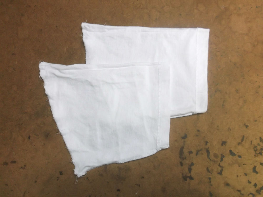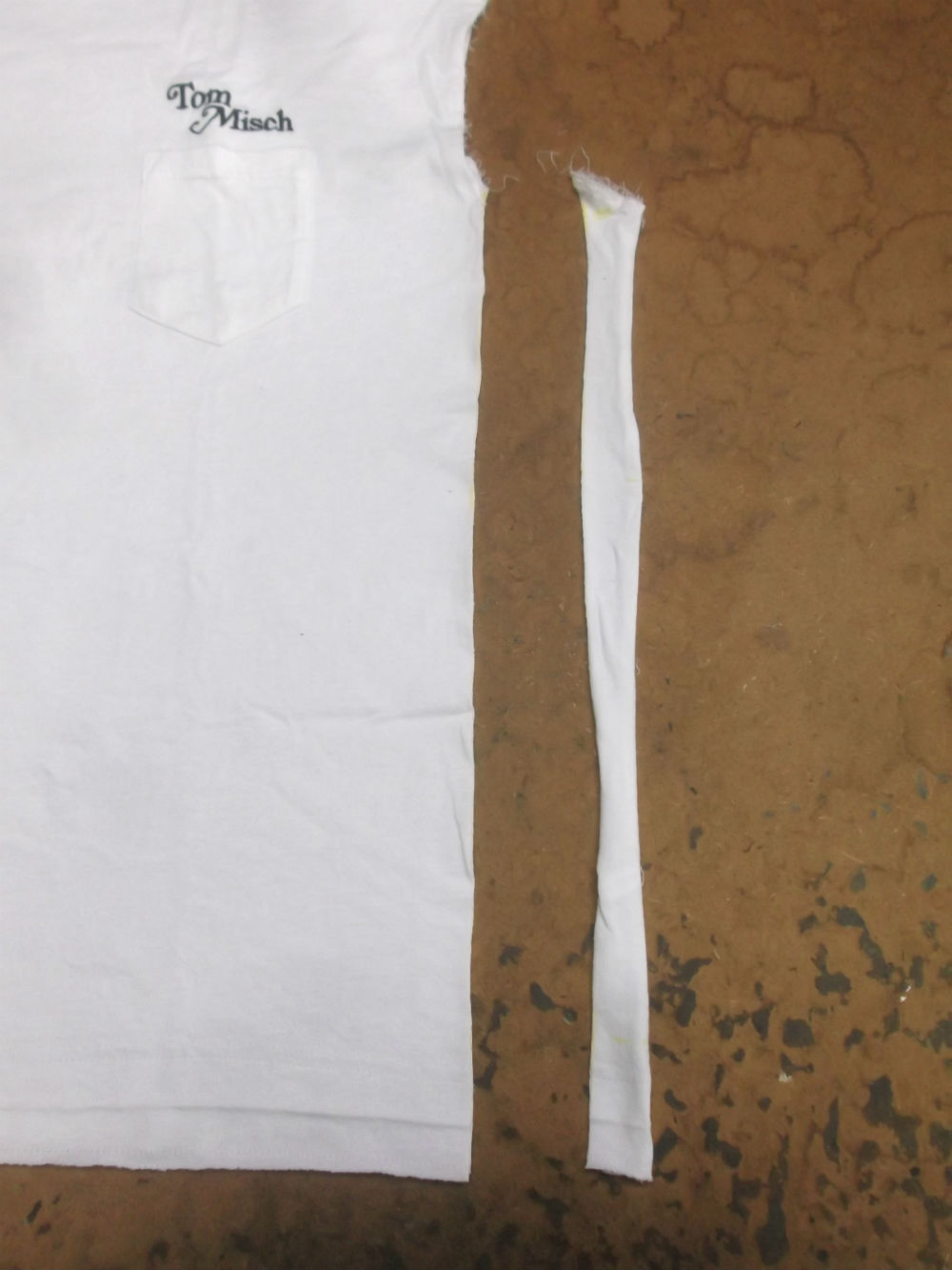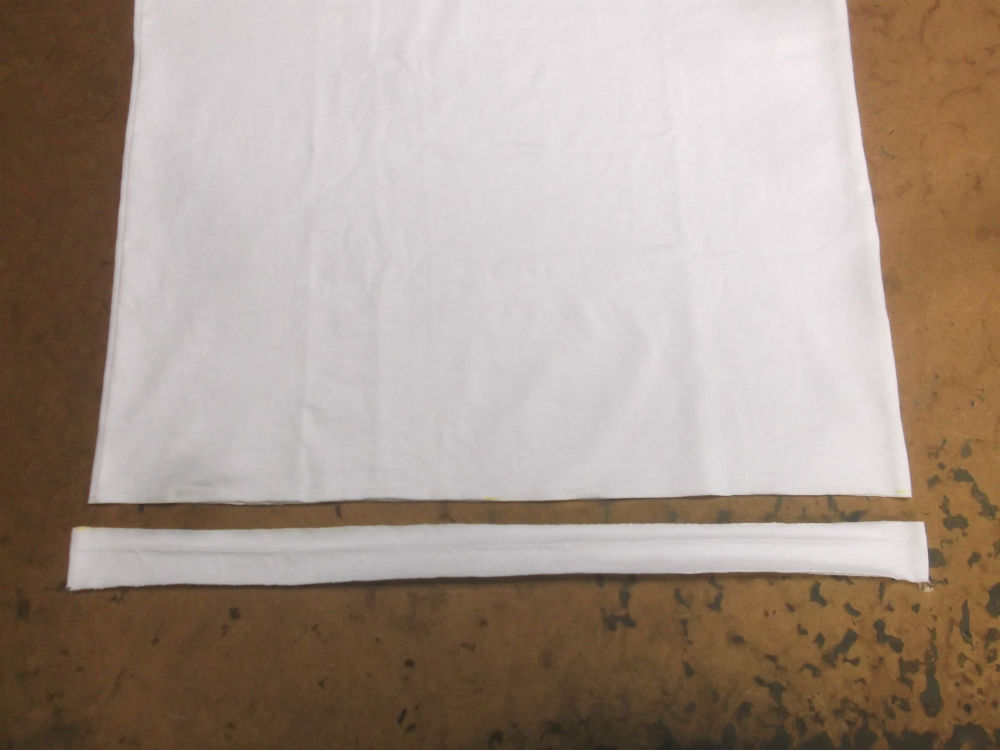 9枚目はTシャツの胴体の着丈以外の肩幅、身幅、裾幅の生地を見本の幅に合う様に生地をカットした後の写真です。