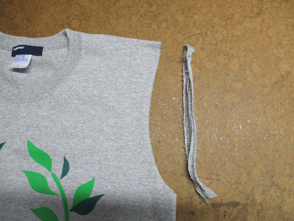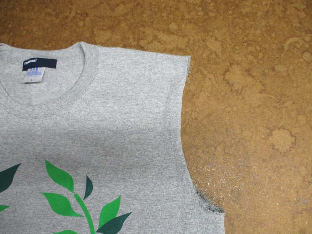 長さを合わせて裾の気にをカットしますと大きいサイズのTシャツの裾の生地の重なった縫い目を折り込んで