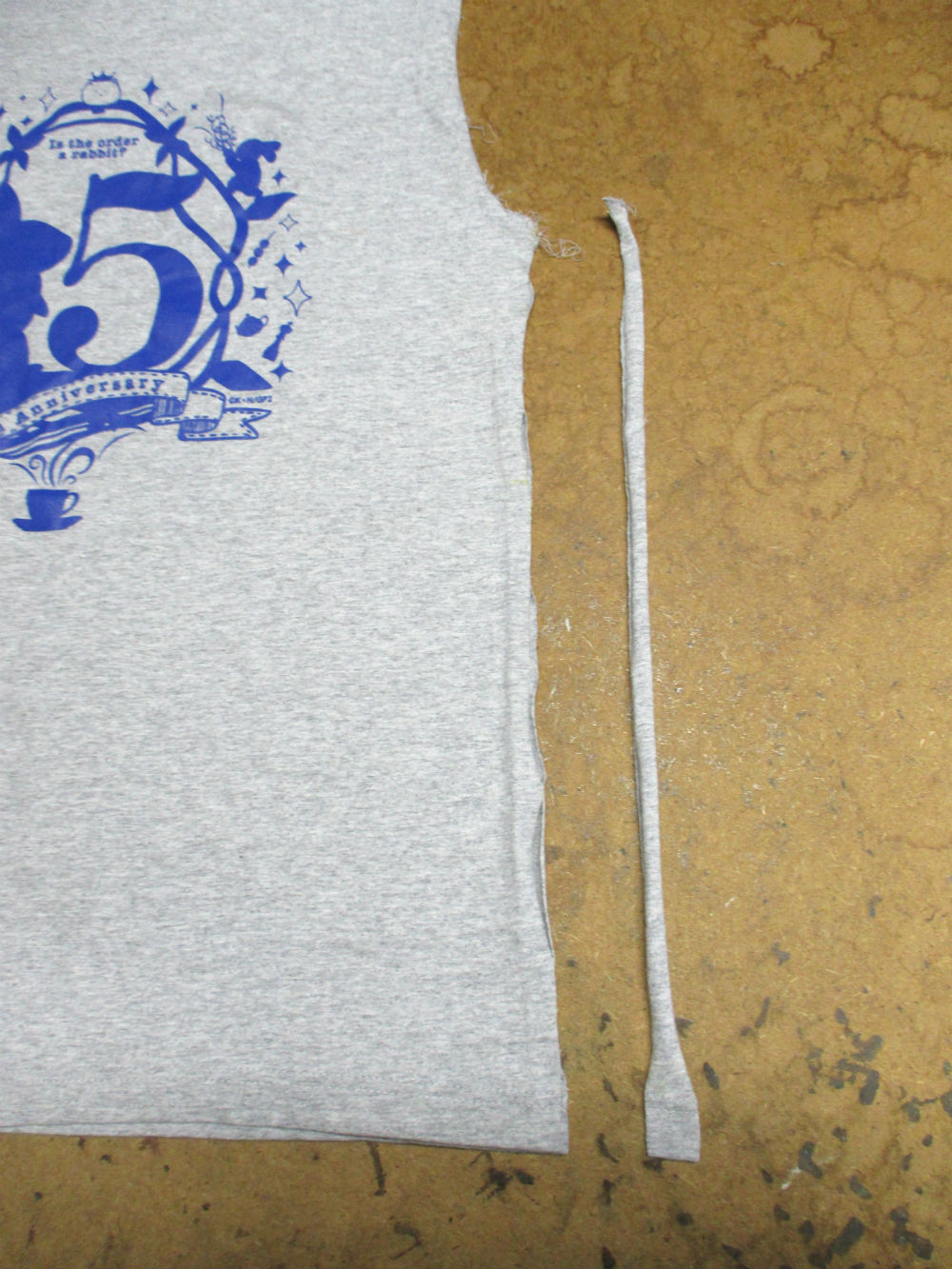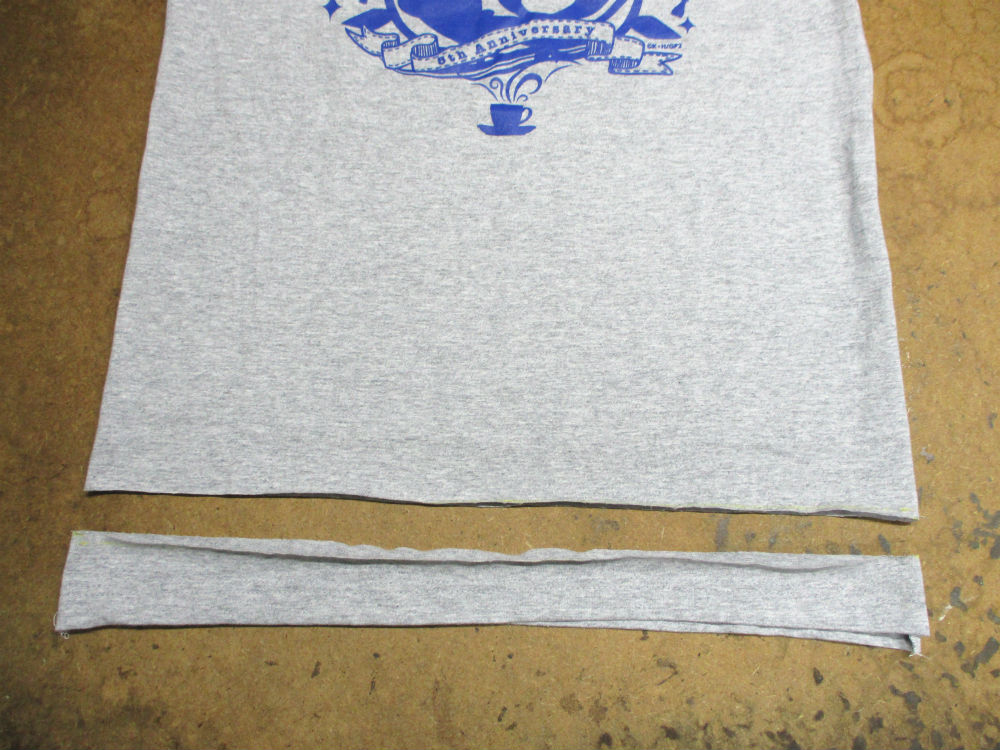 12枚目は長い着丈を見本のTシャツの長さに合わせて裾の生地をカットしていきます。