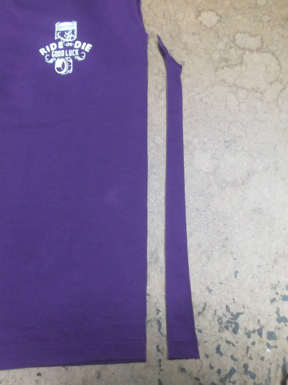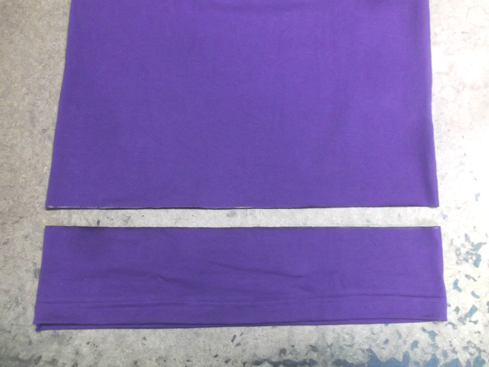 4枚目は見本のTシャツの幅に合う様に脇から裾のサイドの生地をカットしていきます。