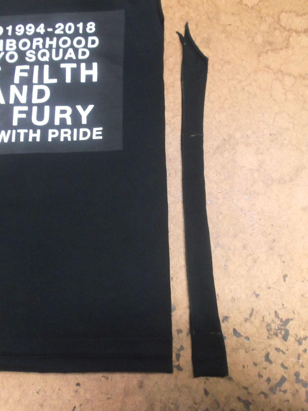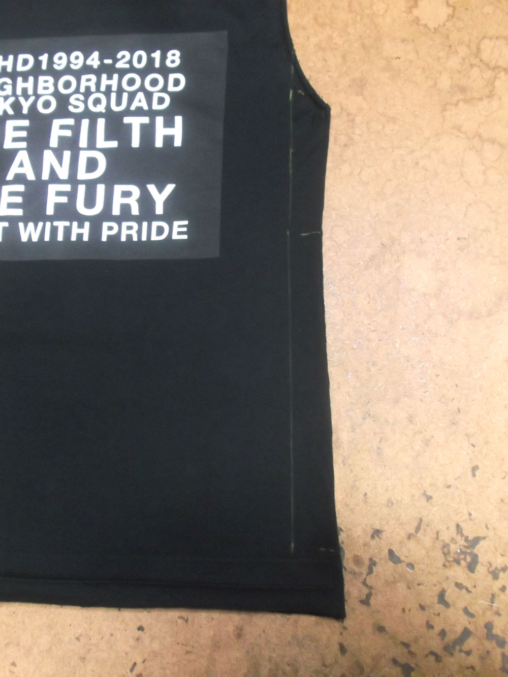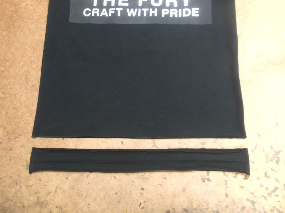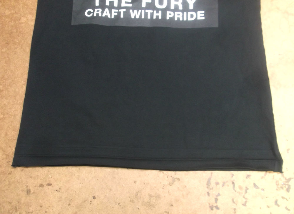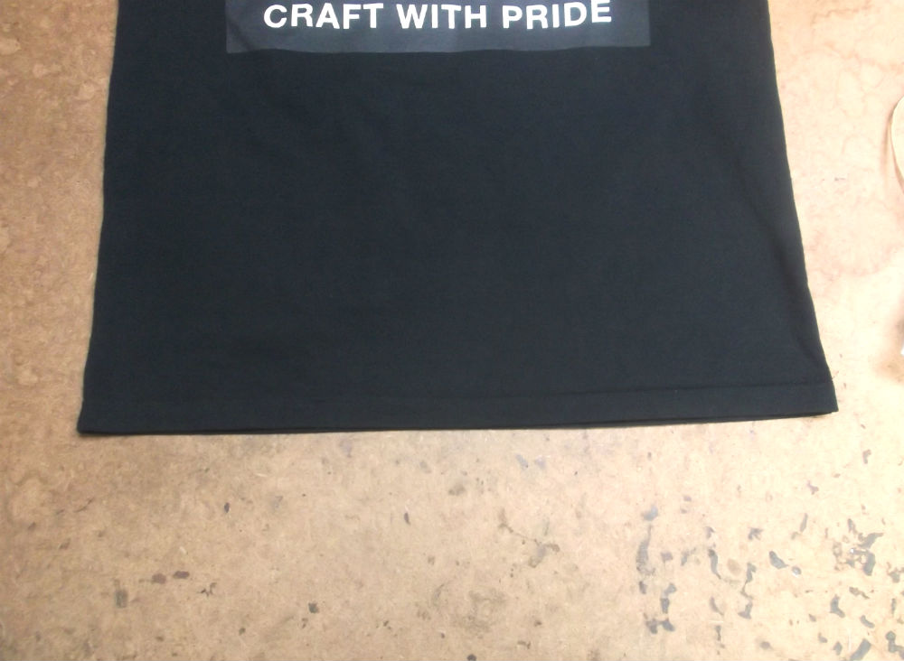 6枚目は脇から裾のサイドの生地をカットして見本のTシャツの幅に合う様にしていきます。