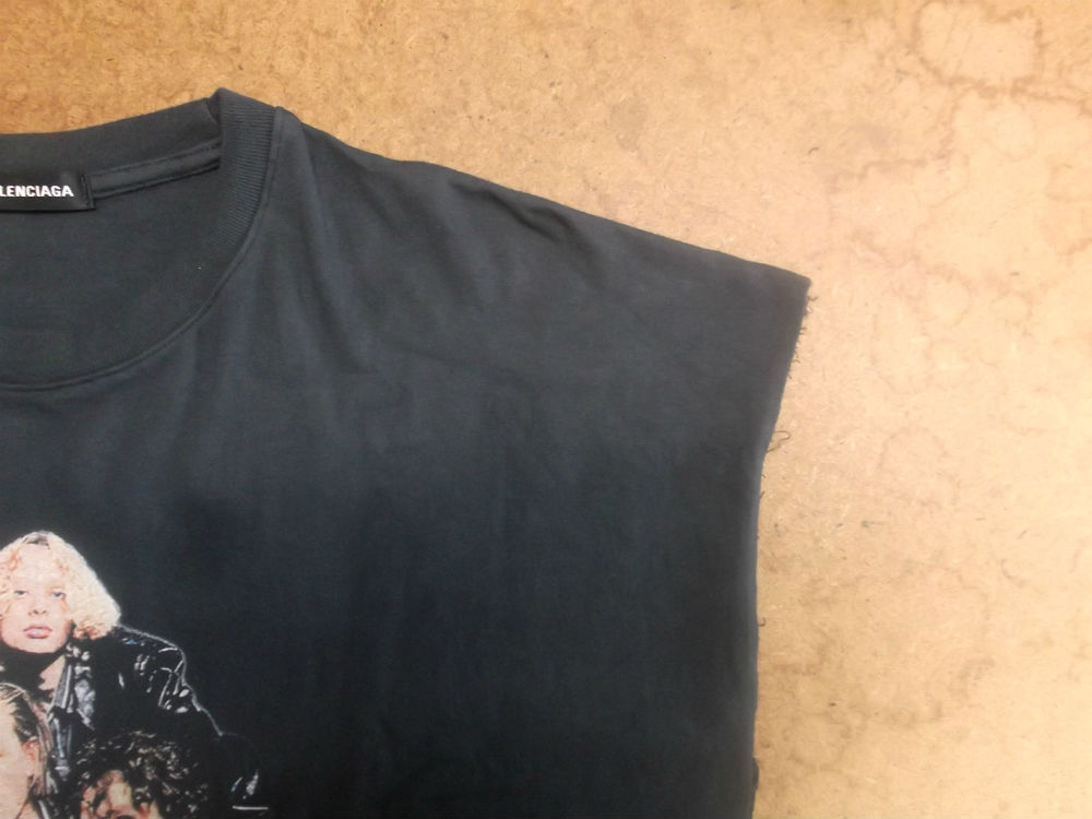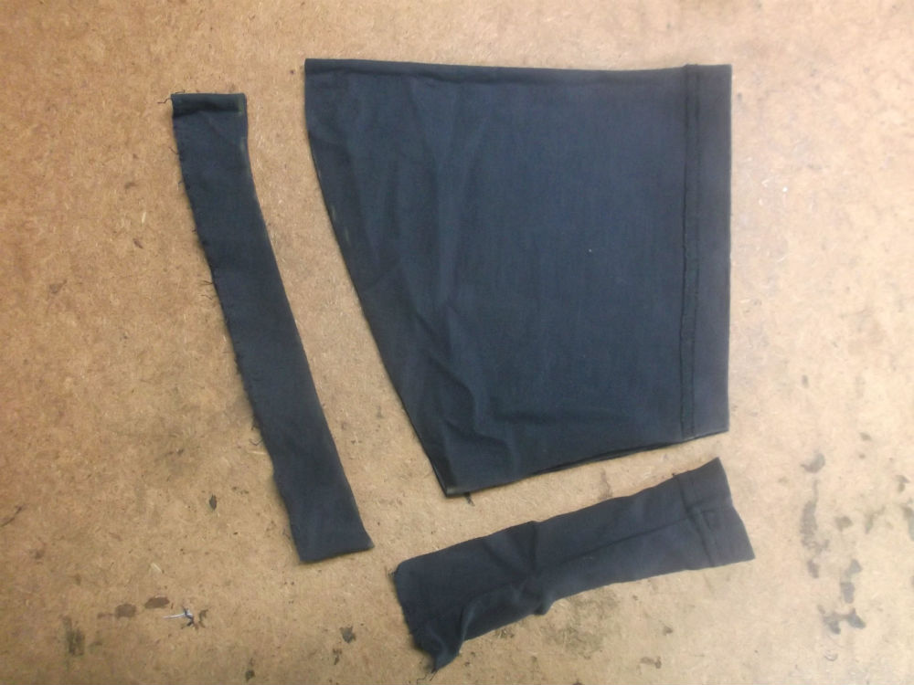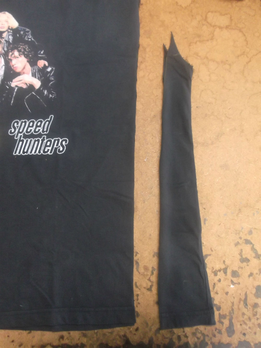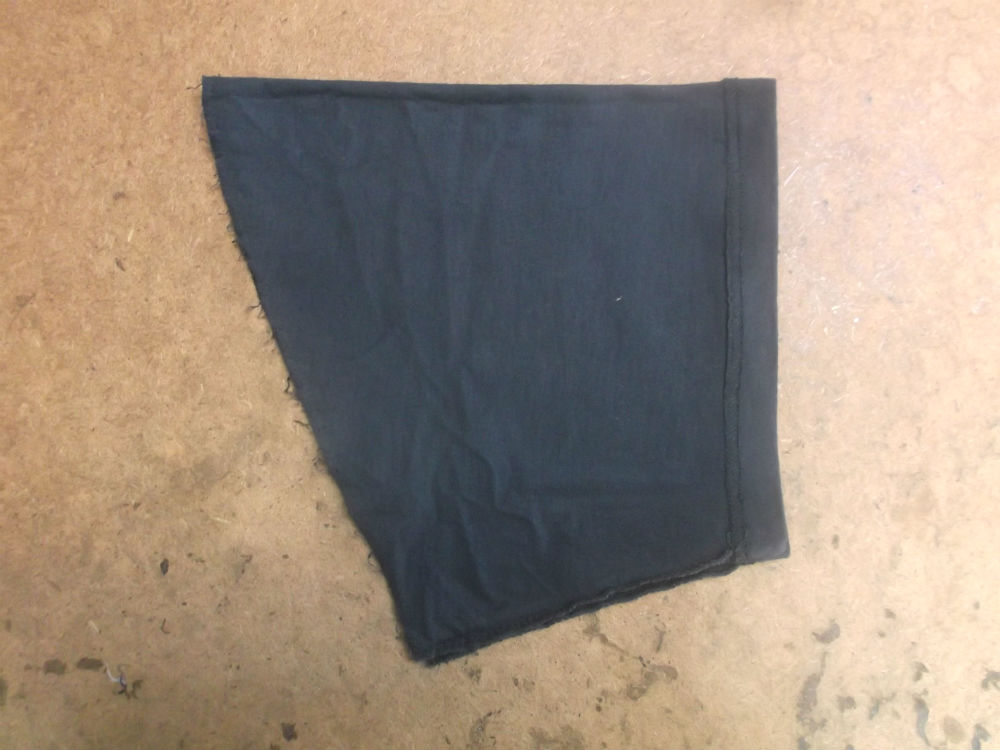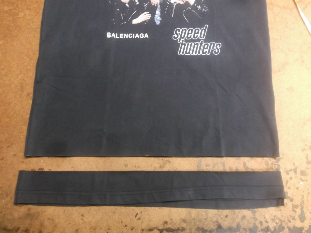 3枚目は左右の袖のパーツを取り外したTシャツの胴体で肩幅、身幅、裾幅、着丈を見本の幅に合う様に生地をカットしていきます。