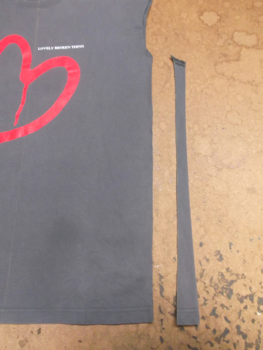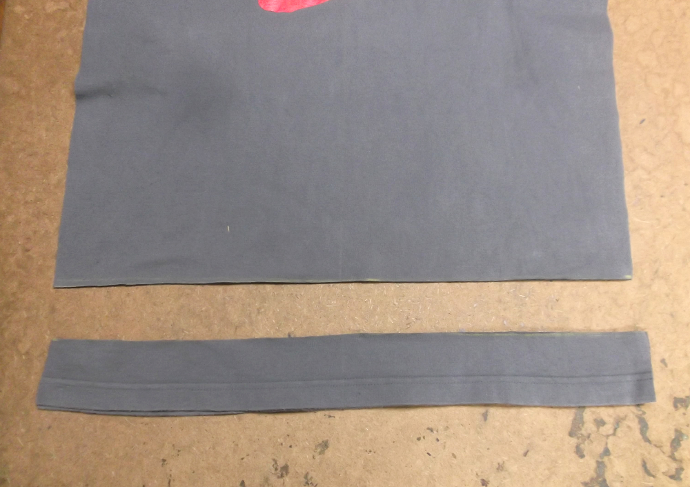 8枚目は長い着丈を見本のTシャツの胴体に合わせて裾の生地をカットしていきます。