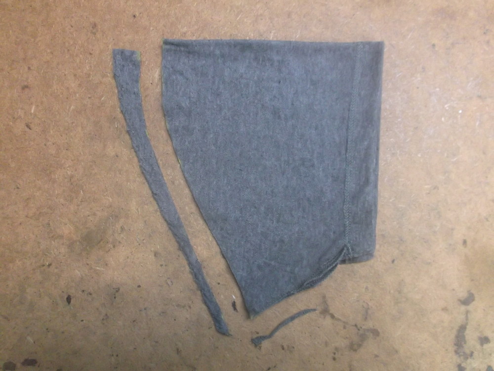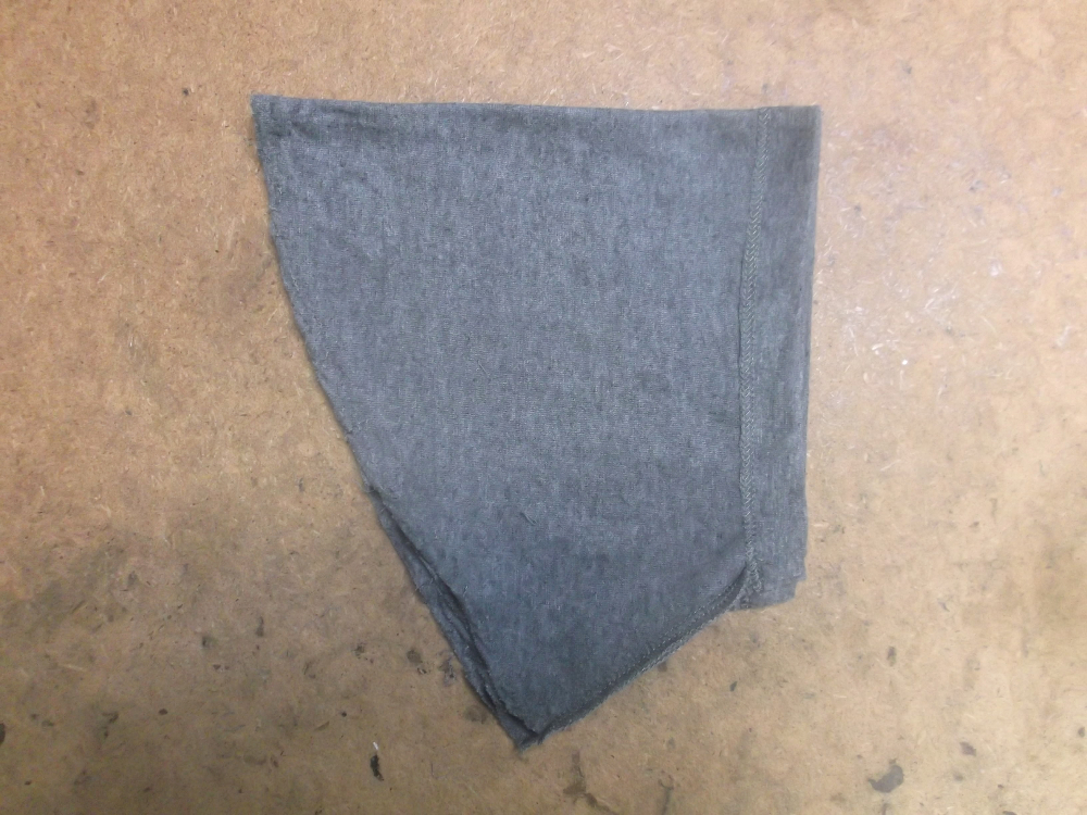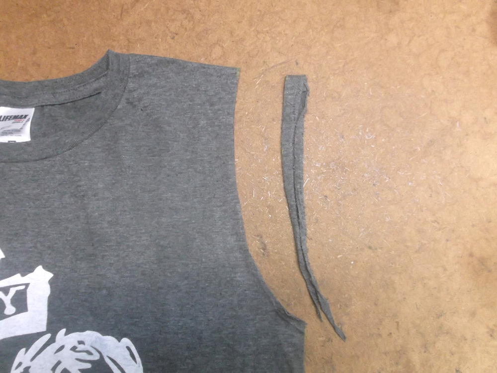 3枚目は左右の袖のパーツを外した後のTシャツの胴体で見本に合う様に肩幅、身幅、裾幅、着丈の生地をカットしていきます。