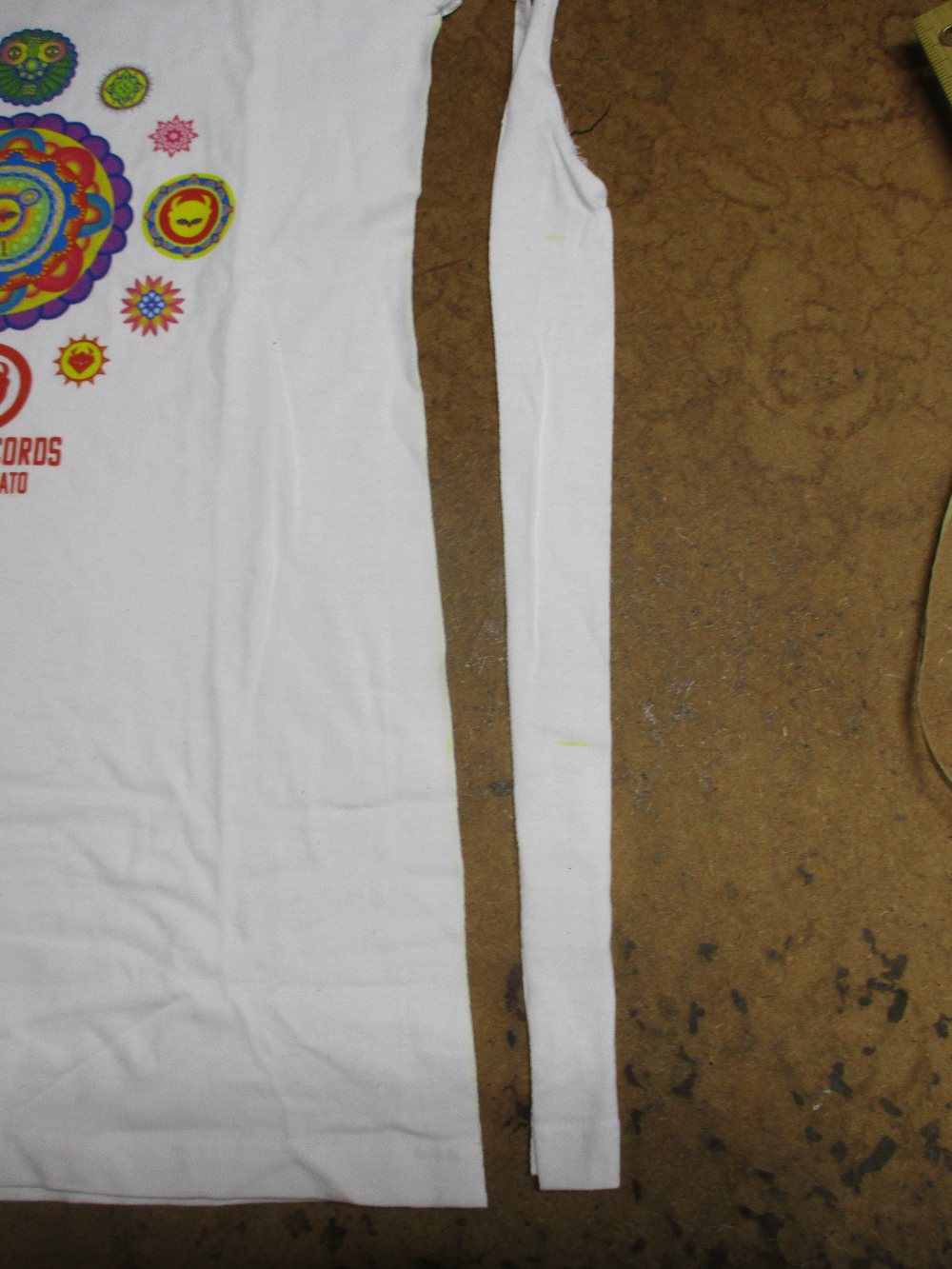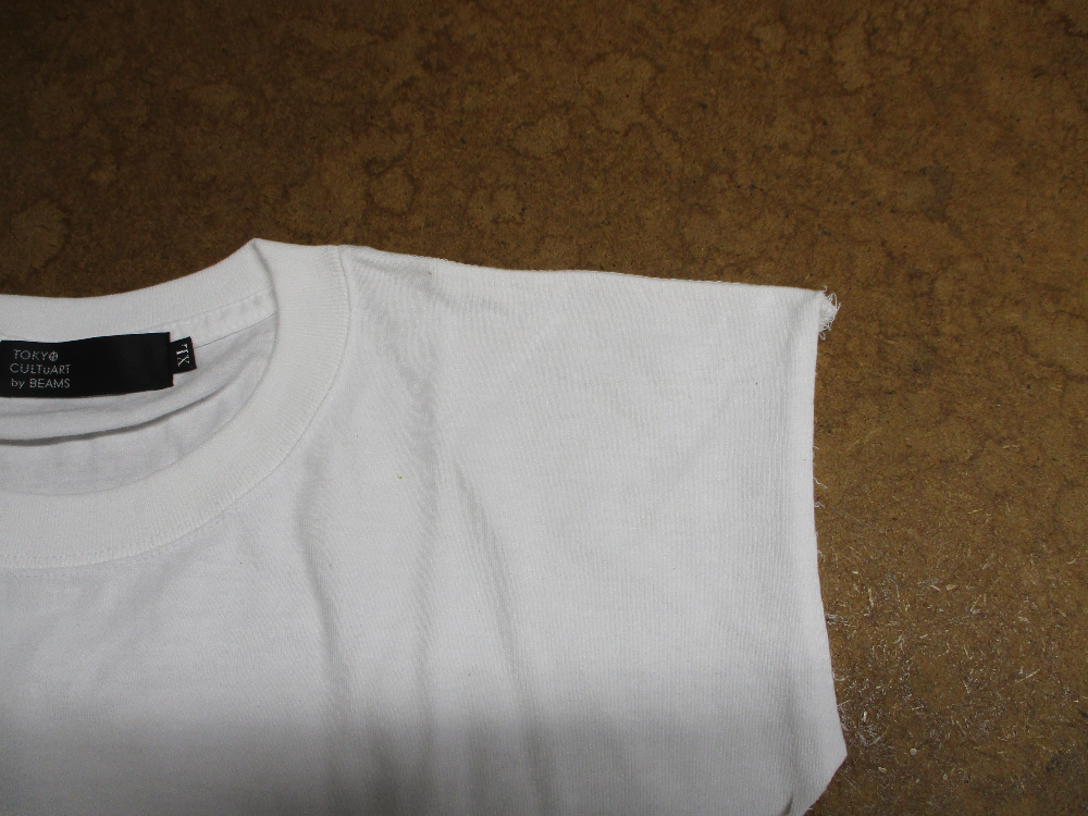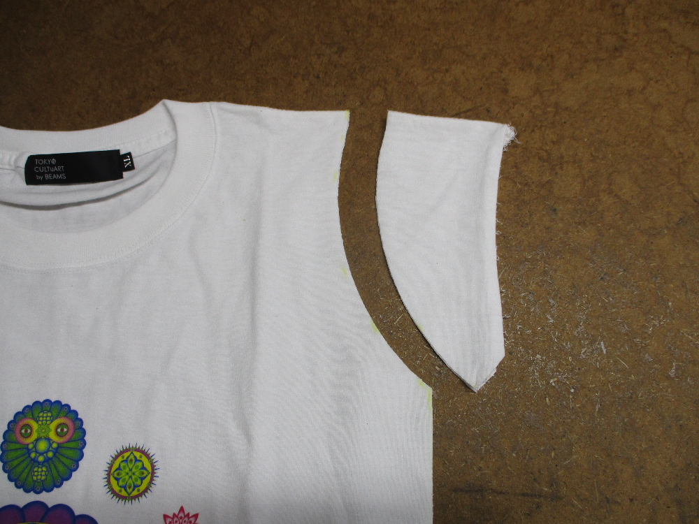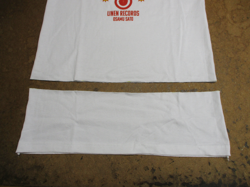 12枚目は長い着丈を見本のTシャツの着丈の長さに合う様に裾の生地をカットします。