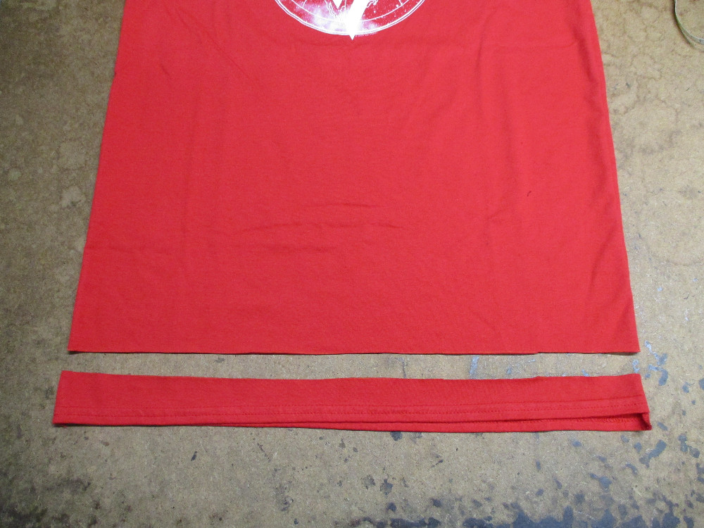 2枚目はお客さんの気に入ったサイズのTシャツでこの肩幅、身幅、裾幅、袖幅、袖丈、着丈を測って大きいサイズのTシャツを小さくしていきます。