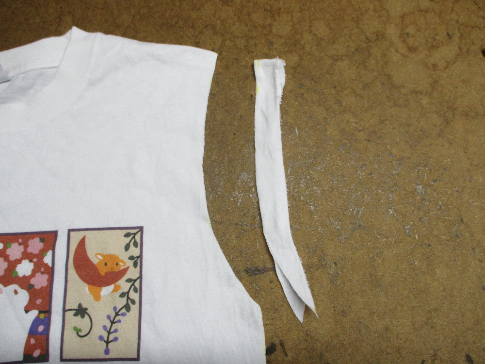8枚目はTシャツの胴体の着丈以外の肩幅、身幅、裾幅の生地をカットした後です。