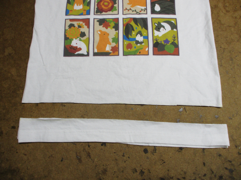 4枚目は脇から裾のサイドの生地をカットして見本のTシャツの幅に合う様にしていきます。