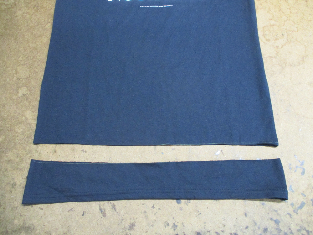 11枚目は長い着丈を見本のTシャツの長さに合う様に裾の生地をカットしていきます。