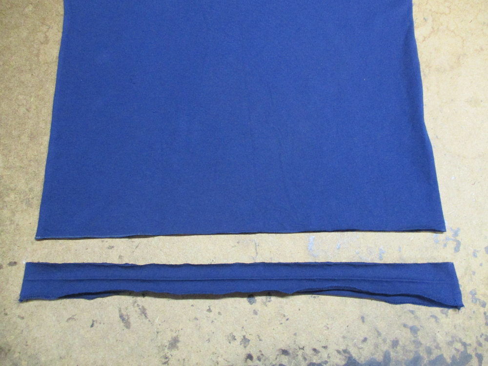 10枚目は長い着丈を見本のTシャツの着丈の長さに合う様に裾の生地をカットしていきます。