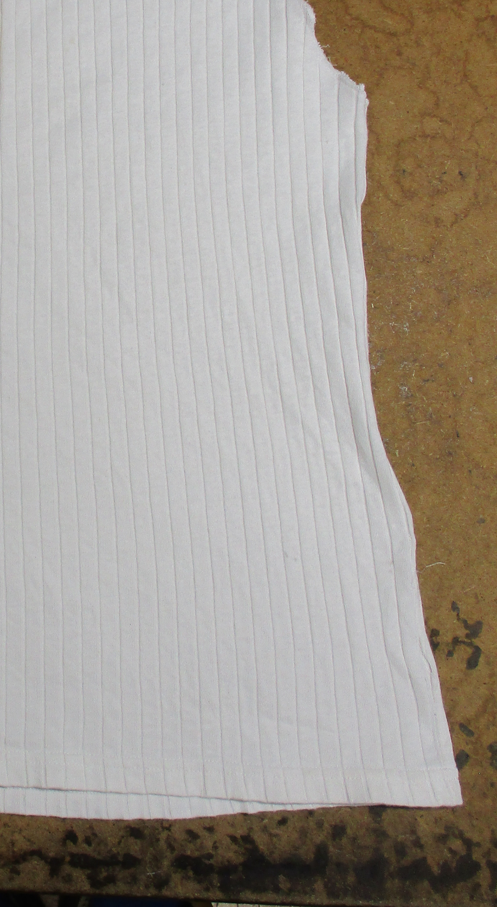 4枚目は脇から裾のサイドの生地を見本のTシャツの幅に合うようにカットしていきます。