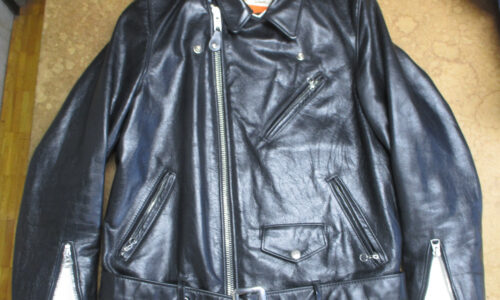 長い袖丈のライダースジャケットを短く修理していきます。今回は来店されたお客さんでライダースジャケットを着ていただいて肩口から袖丈を短くしていくことになり…